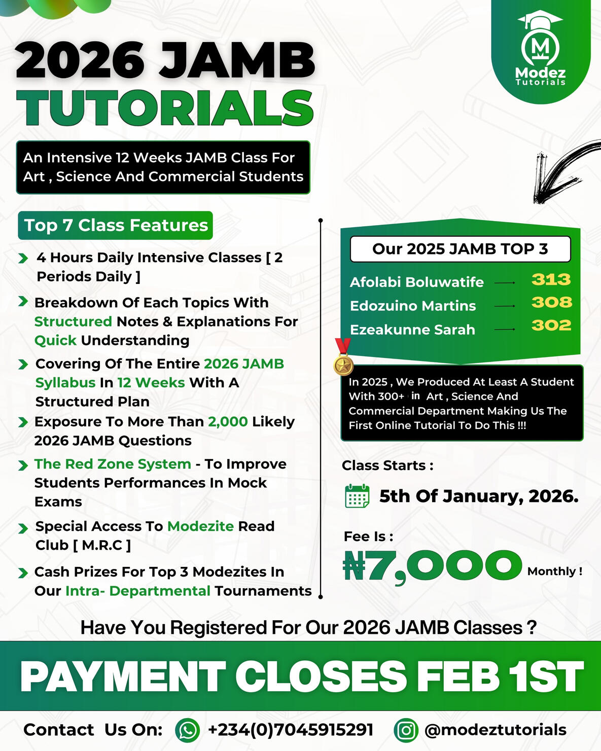 progress . After our ground-breaking records in 2025, where we produced students with 300+ scores in Art, Science, and Commercial departments, we are ready to do even more with you in 2026.We'll No Longer Accept New Students From February 1st So We Can Focus Fully On Our Students Progress & PerformancesClick the button below to contact Modez to make payment and enroll