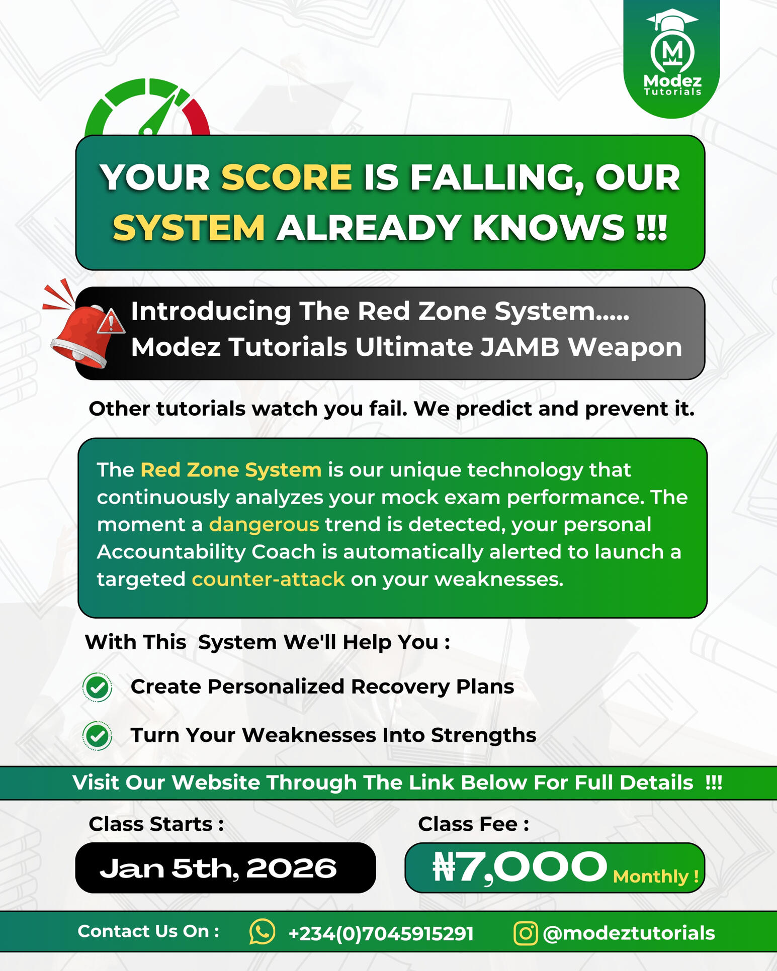 That's Not All ! Our Red Zone System Is A New And Unique Structure To Help Recognize At-Risk Students Early Through Our Mock Exams And Help Them Catch Up With Classes Faster Before Its Too Late !This System Set Us Apart From Other Tutorials....... As We Care About All Our Students And No Single Student Is Left Behind !!!Keep Scrolling As We Have More In Store For You !