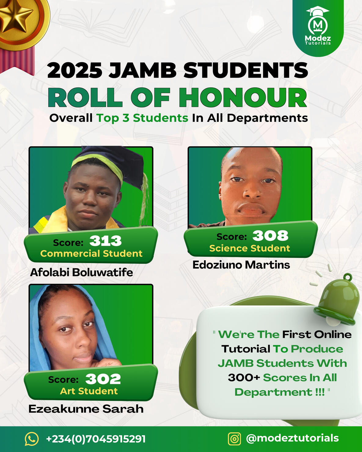 In 2025 JAMB Modez Tutorials Broke An Unusual Record Of The First Online Tutorial In Nigeria To Produce Students 300+ Scores In Science, Art And Commercial DepartmentThis Record Set Us Apart From Others As We Don't Just Focus On One Department !