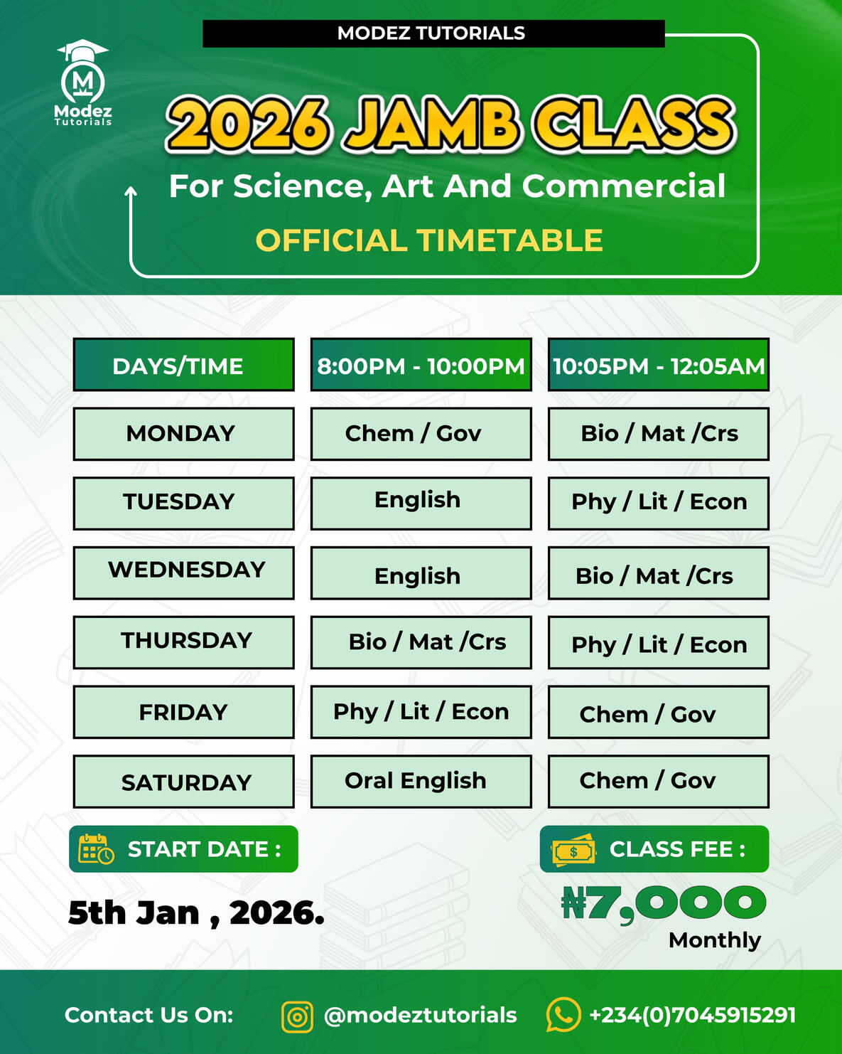 Our 2026 JAMB classes runs daily from 8:00pm - 12:05am, 4 hours daily from Mondays till SaturdaysSundays Are For Our Bimonthly Standard Mock Exams